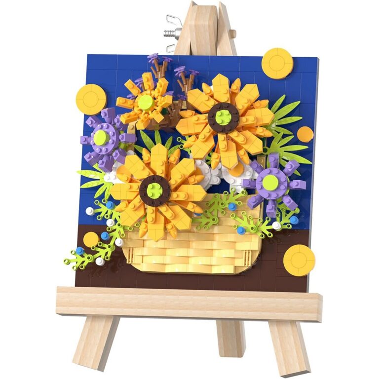 All'interno della confezione troverai tutto il necessario per creare il tuo "dipinto": una base che simula una tela su un cavalletto in legno, e una vasta gamma di piccoli mattoncini colorati che andranno a comporre i petali, le foglie e il vaso del tuo bouquet.