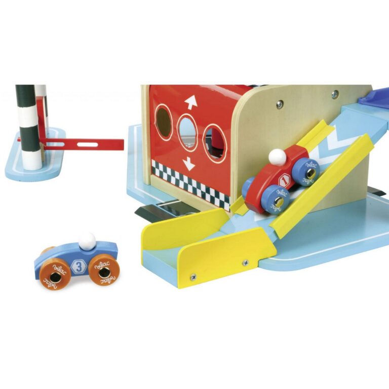 Interamente in legno laccato, è disposto su tre piani, con ascensore e base di atterraggio per elicotteri. Contiene: 2 automobili, 1 elicottero, Ascensore mobile, Barriera automatica, Porta del garage scorrevole, Stazione lavaggio con rulli, Trampolino. 65 x 40 x 45 cm. (3+)
