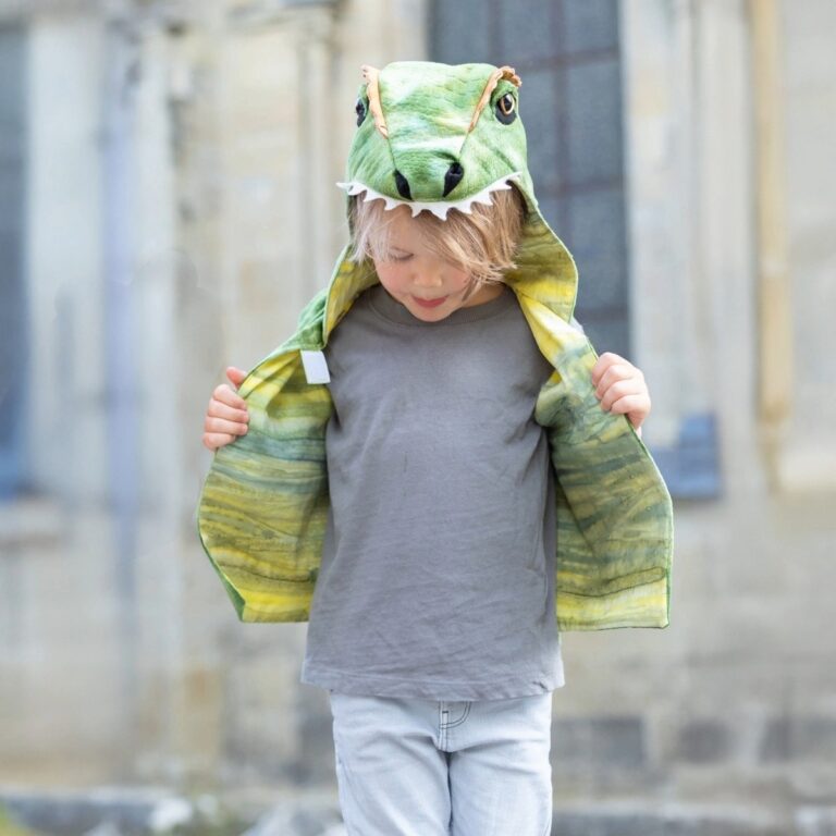 Realizzato in uno speciale tessuto verde goffrato, il gilet riproduce fedelmente la texture delle vere squame di dinosauro, per un look autentico e incredibilmente ispirato al mondo giurassico. Il cappuccio integrato è la vera star: una feroce testa di T-Rex, completa di denti aguzzi lungo i bordi e occhi realistici che danno vita al dinosauro, rendendolo più vivo che mai!