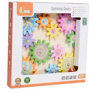 Gioco educativo in legno che introduce i bambini al concetto di ingranaggi e movimento.