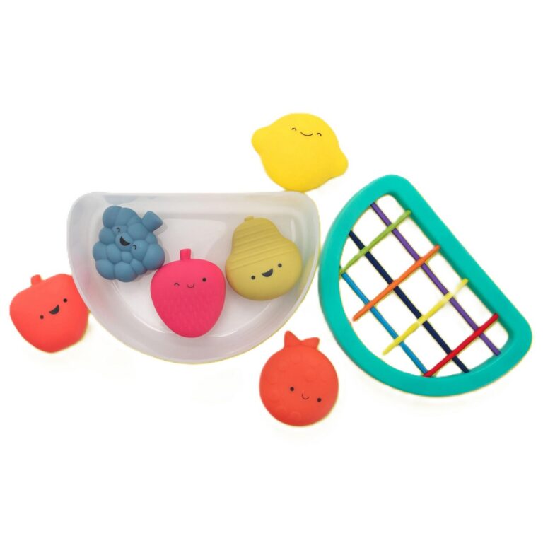 Fruit Fill n’ Spill è un gioco pensato per accompagnare il bambino in diverse fasi della crescita attraverso il semplice gesto di riempire, svuotare e ripetere. I frutti, morbidi e dalla consistenza realistica, invitano il bambino a esplorare con le mani e con la bocca, favorendo lo sviluppo tattile e sensoriale.