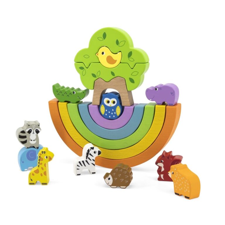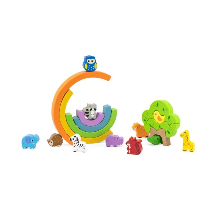 Il set include 5 basi a forma di mezzaluna, che richiamano i colori dell'arcobaleno, 11 tipi di animali e blocchi per formare un albero. L'obbiettivo del gioco è impilare i diversi elementi senza far cadere l'intera struttura, il che richiede concentrazione e precisione.
