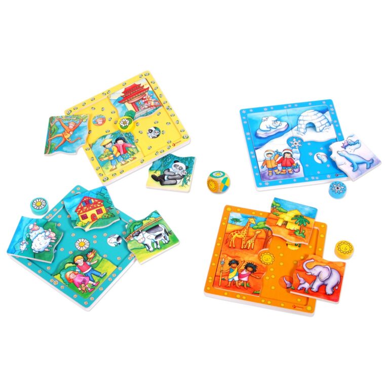 Gioco e Imparo Puzzle in legno a tema abitanti del mondo. Tirando il dado, i bambini sceglieranno il pezzo da inserire nel puzzle.
