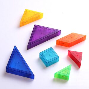 - 61 Pezzi per Composizioni Creative: Il set include una ricca varietà di piastrelle magnetiche trasparenti in forme geometriche uniche e colori vivaci. Troverai diversi tipi di triangoli (grandi, medi, piccoli, isoceli), quadrati, rombi allungati, rettangoli e perfino elementi circolari con magneti. Queste forme, ispirate al Tangram, permettono di creare una moltitudine di figure, da animali a persone, veicoli o costruzioni astratte.