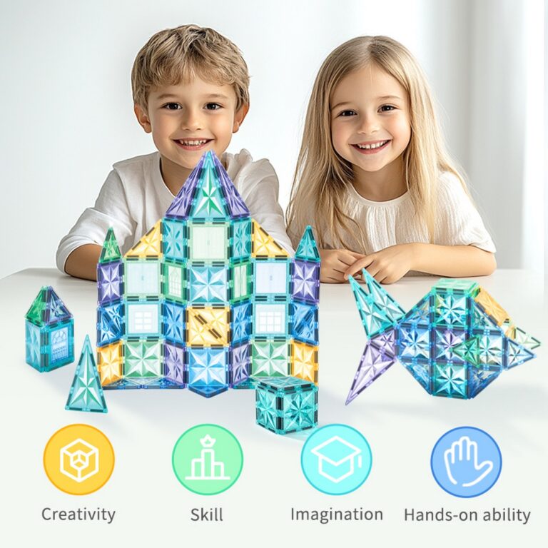 Costruzioni Robuste e Decorative: I magneti potenti assicurano che le costruzioni siano stabili, permettendo ai bambini di creare sia strutture semplici che castelli elaborati con torri e finestre. I motivi a stella aggiungono un elemento decorativo che rende ogni costruzione unica.