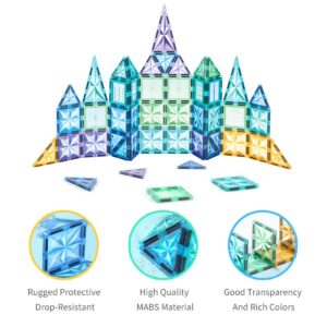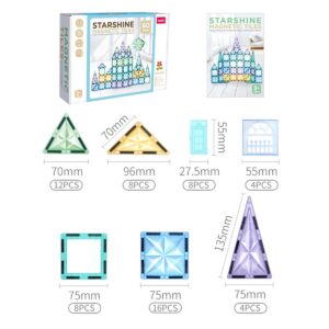 60 Pezzi per Creazioni Scintillanti: Il set include un'accurata selezione di piastrelle magnetiche di diverse forme geometriche (triangoli da 70mm, triangoli grandi da 96mm, quadrati da 75mm, finestre e porte da 55mm e 27.5mm, e triangoli a punta da 135mm) in tonalità pastello e iridescenti. La caratteristica distintiva sono le piastrelle con motivi a stella incisi o con design a raggio che riflettono la luce.