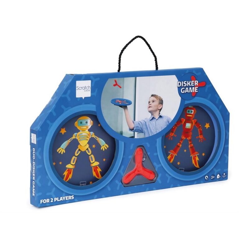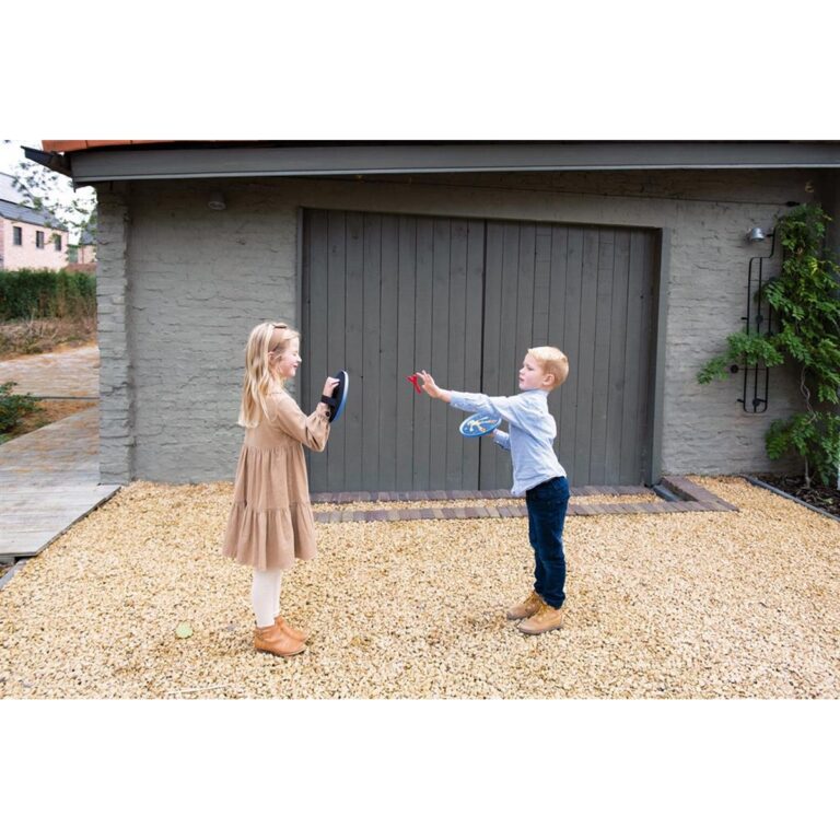 Duo Disker Set - Questo set contiene 2 paddle e 1 disker in silicone. La racchetta può essere fissata intorno alla mano con il cinturino in velcro. Lancia il disker all'altro giocatore. Poi è il suo turno di lanciare.... prova a prenderlo! Divertimento senza fine sia per interni che per esterni. Ideale da portare ovunque. Età: 3+