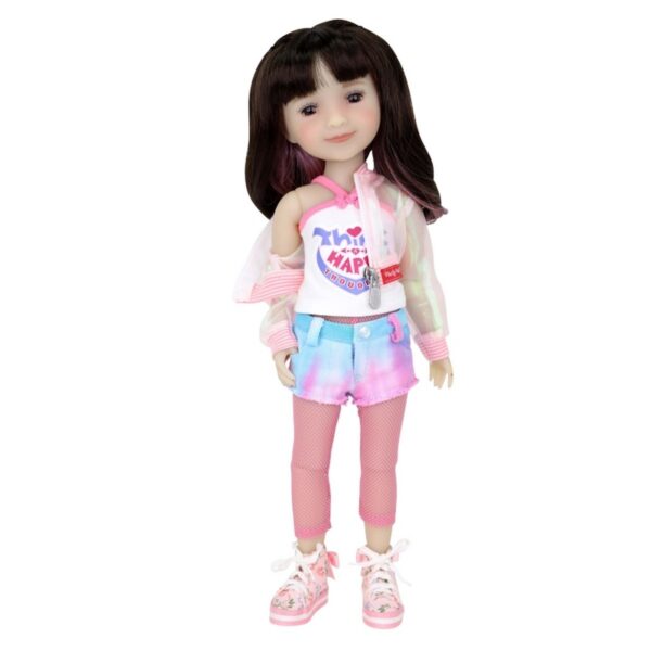 Bambola Hanna Splash of Style Ruby Red Fashion Friends - Hanna crede negli arcobaleni, negli unicorni e nella gioia del mondo. Vuole che tutti siano incredibilmente felici. È certa che tutto sia possibile con un atteggiamento positivo! Hanna vuole diffondere la felicità attraverso la danza... quando lei e le sue amiche ballano, sono in grado di scuotere il mondo con stile! Hanna ha bellissimi capelli scuri con ciocche rosa a contrasto. Indossa una scintillante giacca a rete rosa iridescente sopra alla canotta "Think Happy Thoughts", un grazioso paio di pantaloncini effetto tie-dye rosa e blu. Sotto i suoi pantaloncini ci sono un paio di scioccanti leggings a rete rosa neon che indossa con un paio di graziose scarpe alte floreali rosa, rifinite con un adorabile fiocco sui talloni. Bambola alta circa 37 cm con 9 articolazioni, corpo in vinile di alta qualità. Età: 6+