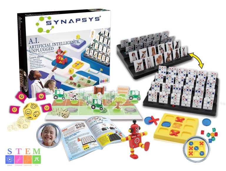 Il kit INTELLIGENZA ARTIFICIALE è un esplosione di giochi, storie, rompicapi e dilemmi etici che esplorano le logiche e il funzionamento alla base di questa innovativa tecnologia.