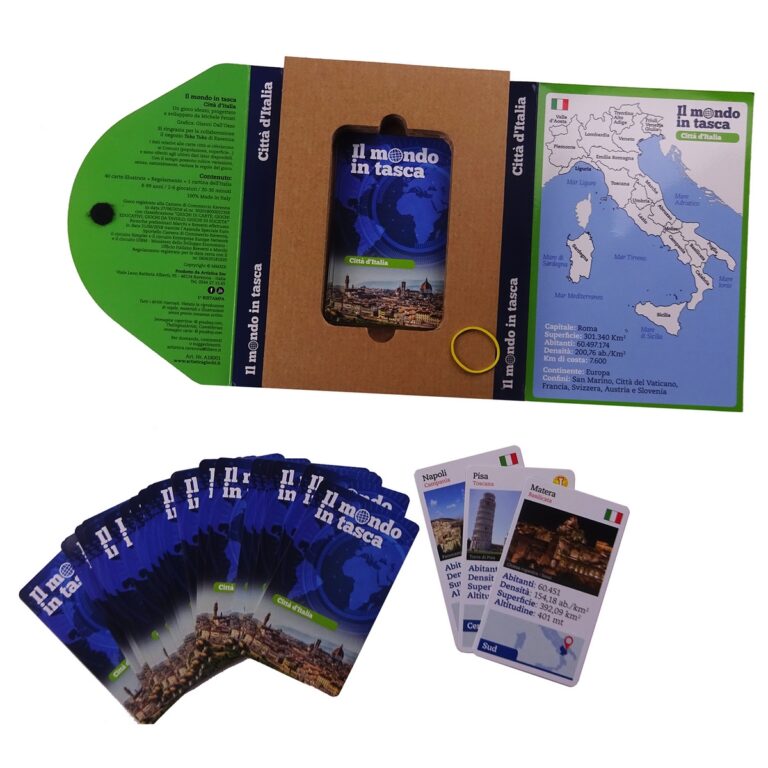Contenuto: 40 carte illustrate, regolamento, 1 cartina d’Italia.