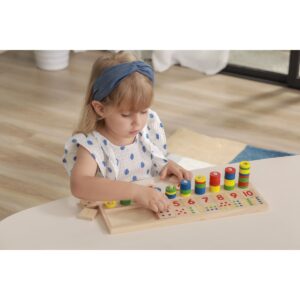 Realizzato con materiali di alta qualità, sicuri e durevoli, questo giocattolo incoraggia i bambini a contare, corrispondere i numeri ai loro spazi e familiarizzare con i primi concetti matematici di base come l'associazione numerica e l'ordinamento.