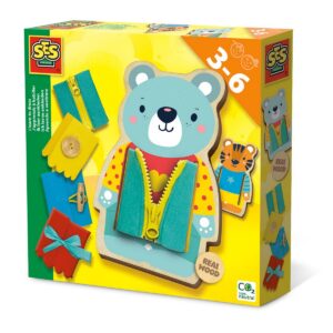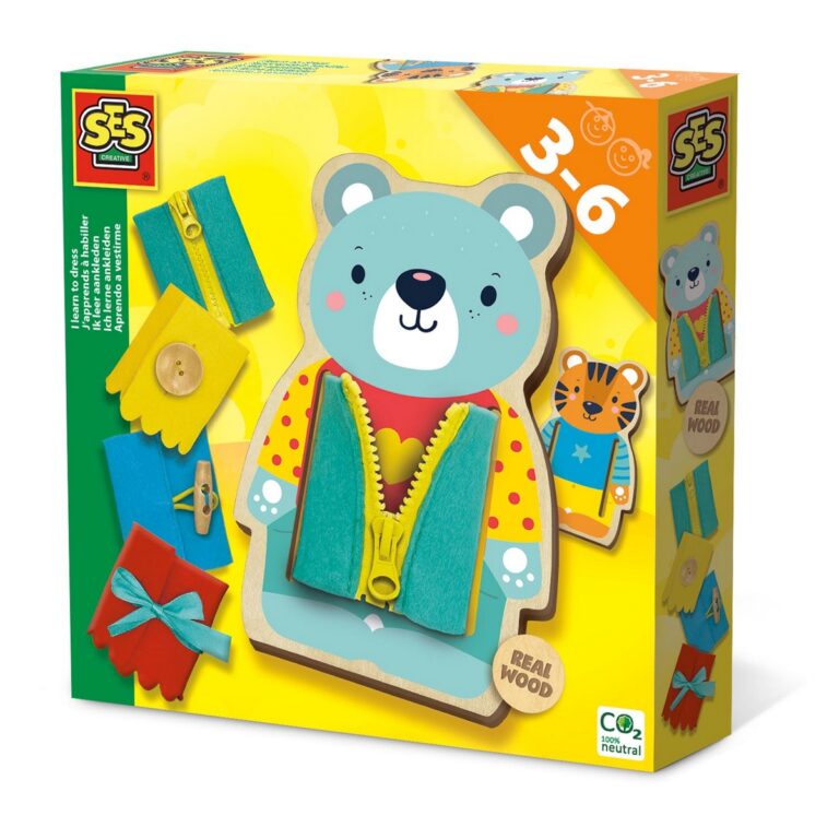 Scopri i quattro tipi diversi di chiusura e fai in modo che gli animali stiano al calduccio. Il set contiene una serie di animali in legno da vestire (su due lati) e giacche che si chiudono con bottone, laccio, olivetta o zip.
