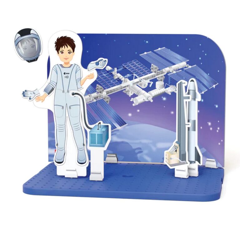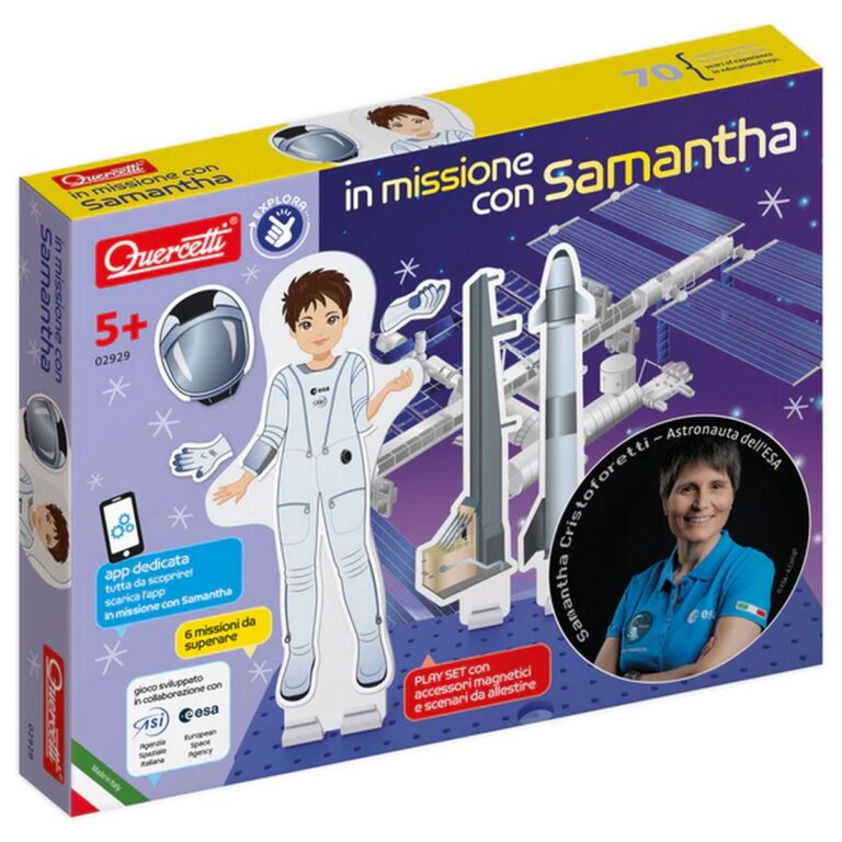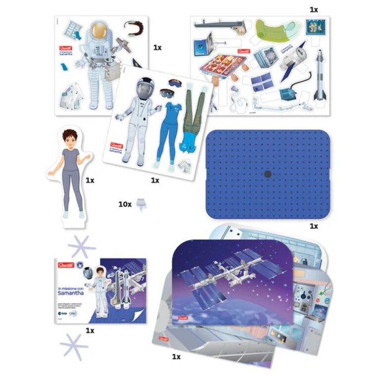 Vuoi diventare un astronauta e conoscere le straordinarie esperienze che si vivono sulla Stazione Spaziale Internazionale? Palyset con accessori magnetici e scenari da allestire. CONTENUTO SCATOLA: 1 base, 10 pinze, 1 sagoma con la figura di Samantha, 21 sagome magnetiche, 12 sagome illustrate, 4 sfondi illustrati, 1 libretto