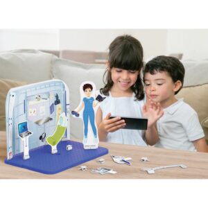 Trova tutti quelli che servono a Samantha; inserisci sfondi e sagome in cartone nella tavoletta traforata, applica gli accessori magnetici su Samantha e l’app ti dirà se la missione è stata superata!