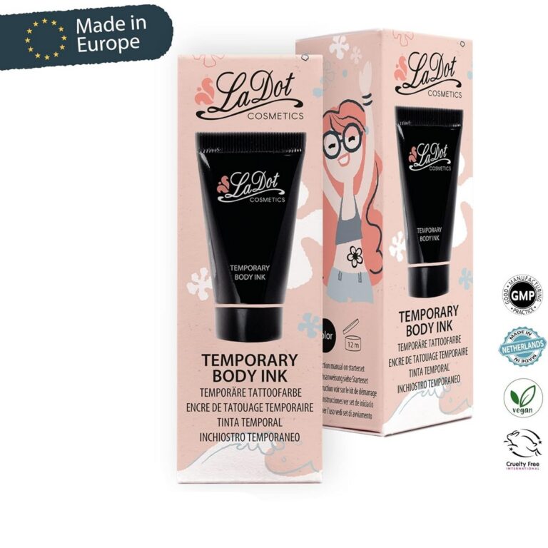 Tubo con 15 ml di inchiostro nero per tatuaggi temporanei. I prodotti cosmetici LaDot sono vegani e non testati sugli animali, sono rigorosamente testati e certfcati secondo i requisiti di legge europei. Prodotto nei Paesi Bassi.