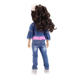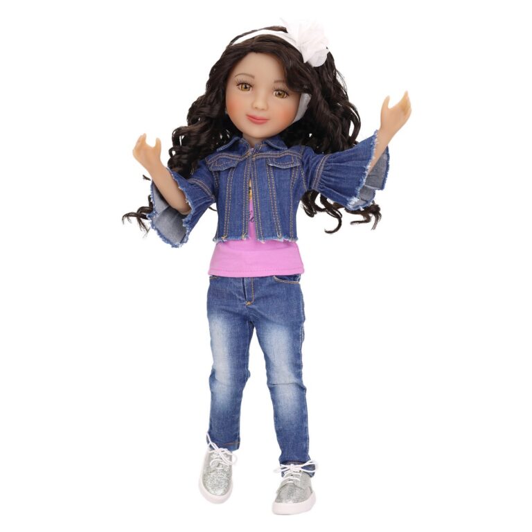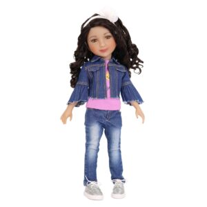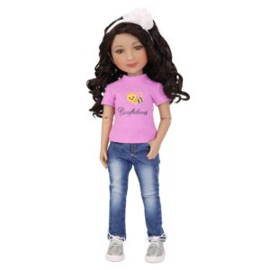 Bambola Kayla Ruby Red Fashion Friends - Kayla punta a fare sempre del suo meglio. È sempre in movimento e pratica un' infinità di attività sportive. Dal calcio al tennis alla ginnastica e fa tutto con grinta e stile puntando sempre al gradino più alto del podio. Kayla ha lunghi capelli castani ricci e una fascia a fiori bianchi. Indossa la sua maglietta "Be Confident", una giacca di jeans con maniche a volant molto elegante, jeans con lavaggio invecchiato e scarpe da ginnastica scintillanti d'argento. Bambola alta circa 37 cm con 9 articolazioni, corpo in vinile di alta qualità. Età: 6+