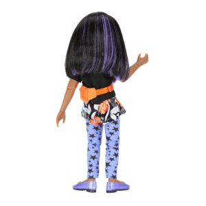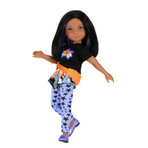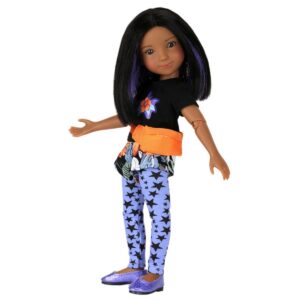 Bambola Kelsey - Ruby Red Siblies. Kelsey pratica diversi sport, ama la vita all'aria aperta e le escursioni con la sua famiglia e i suoi amici. Kelsey ha i capelli scuri con meches viola e indossa una maglietta nera con orchidea, pantaloncini con orchidee abbinati e leggings viola con stampa di stelle. Ha ballerine viola scintillanti e un marsupio arancione. Queste bellissime bambole in vinile, alte circa 30,5 cm e con 9 punti di articolazione, sono sorelle, fratelli e amiche!! Amano la musica, la danza, lo sport, l'amicizia e il divertimento. Età: 3+