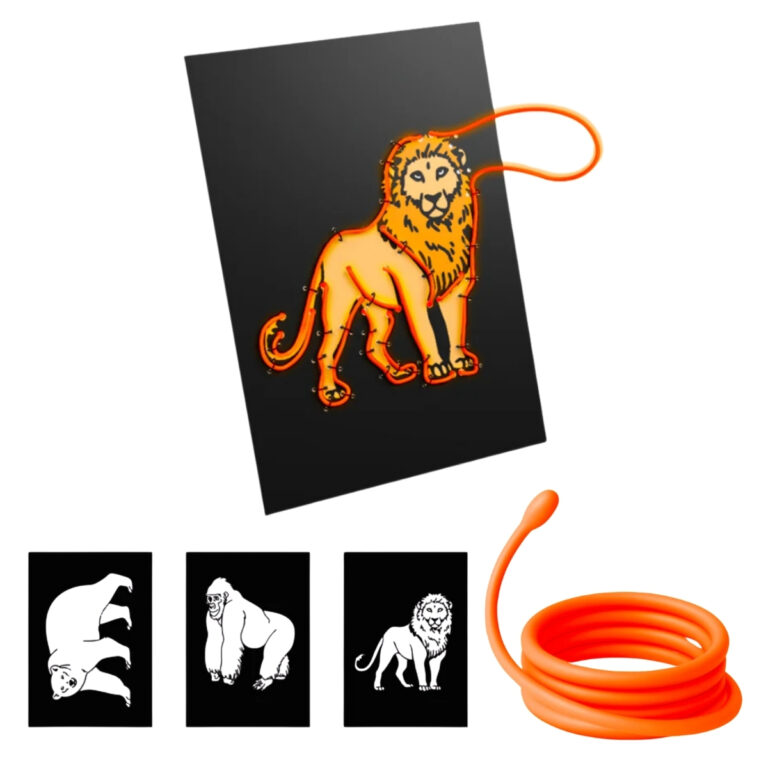 Il gioco è semplice e intuitivo: il bambino sceglie una delle tavole preforate con disegni di simpatici animali e inserisce il filo luminoso seguendo i fori già tracciati. Poco alla volta il disegno prende forma e si illumina, trasformandosi in una decorazione brillante da appendere o appoggiare in cameretta.