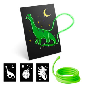 Il gioco è semplice e intuitivo: il bambino sceglie una delle tavole preforate con i disegni dei dinosauri e inserisce il filo luminoso seguendo i fori già tracciati. Poco alla volta il disegno prende forma e si illumina, trasformandosi in una decorazione brillante da esporre in cameretta.