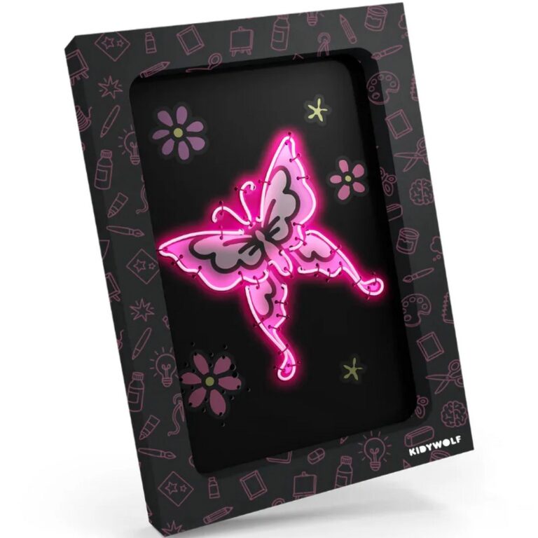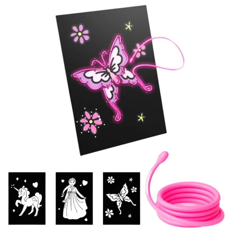 KIDYNEON Favole è un kit creativo luminoso pensato per i bambini che amano unicorni, principesse e farfalle. Con il filo effetto neon rosa, ogni disegno prende vita con una luce brillante e magica, trasformandosi in una decorazione da appendere o appoggiare in cameretta.