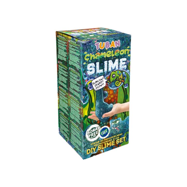 Kit Slime DIY Camaleonte TUBAN con glitter minerali verdi e rossi, per uno slime scintillante bicolore. Divertente, sensoriale e sicuro. Made in EU, ideale dai 6 anni.