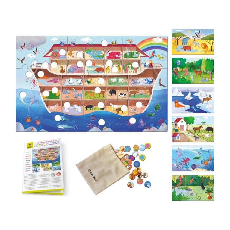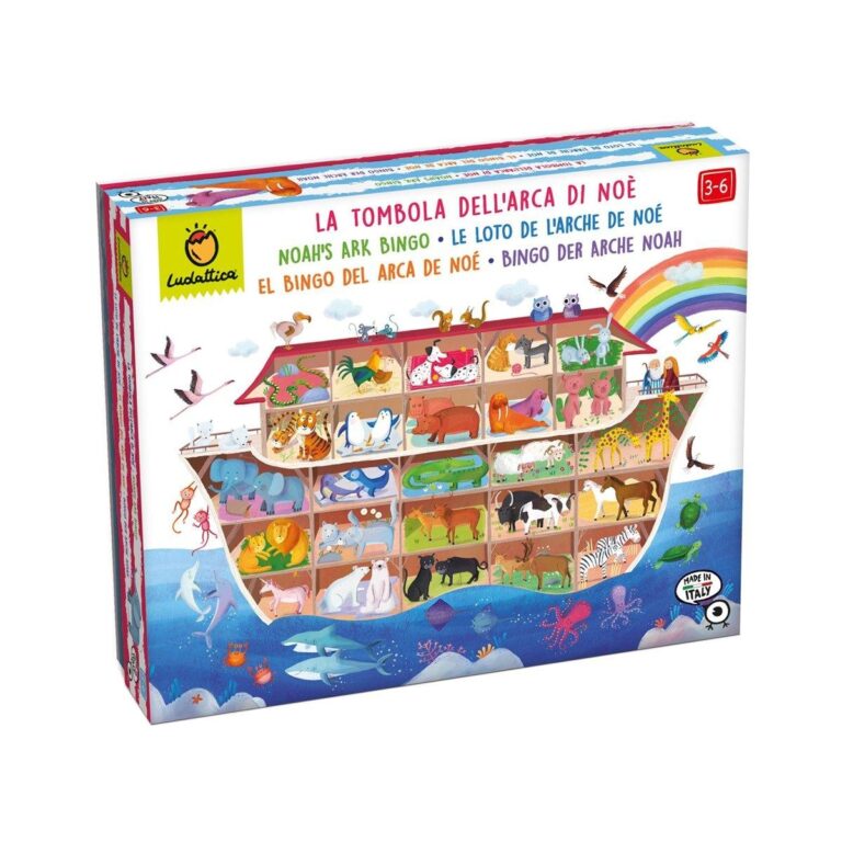La tombola dell’arca di Noè - Gioco da tavolo. Tutti a bordo, si parte! Aiutiamo Noè a salvare gli animali dal diluvio. Una tombola originale, in cui per vincere bisogna riuscire a far salire tutti gli animali della propria cartella-habitat sulla grande arca. Ma attenzione… pescare il dodo o il liocorno può ostacolare la strada verso la vittoria! Contenuto: Grande tabellone tombola, 6 cartelle ambienti , 74 gettoni animali, Sacchetto, Istruzioni. Età: 3+