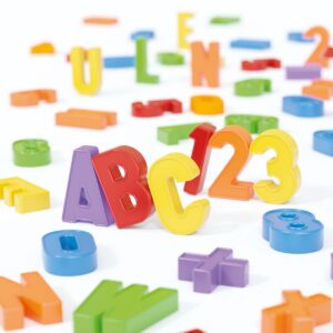 48 lettere, 48 numeri magnetici e 10 calamite per comporre le prime parole, per fare le prime operazioni oppure per scrivere colorati messaggi sulla porta del frigorifero o su qualsiasi superficie metallica.