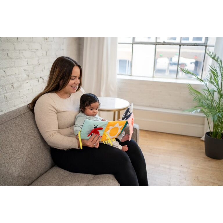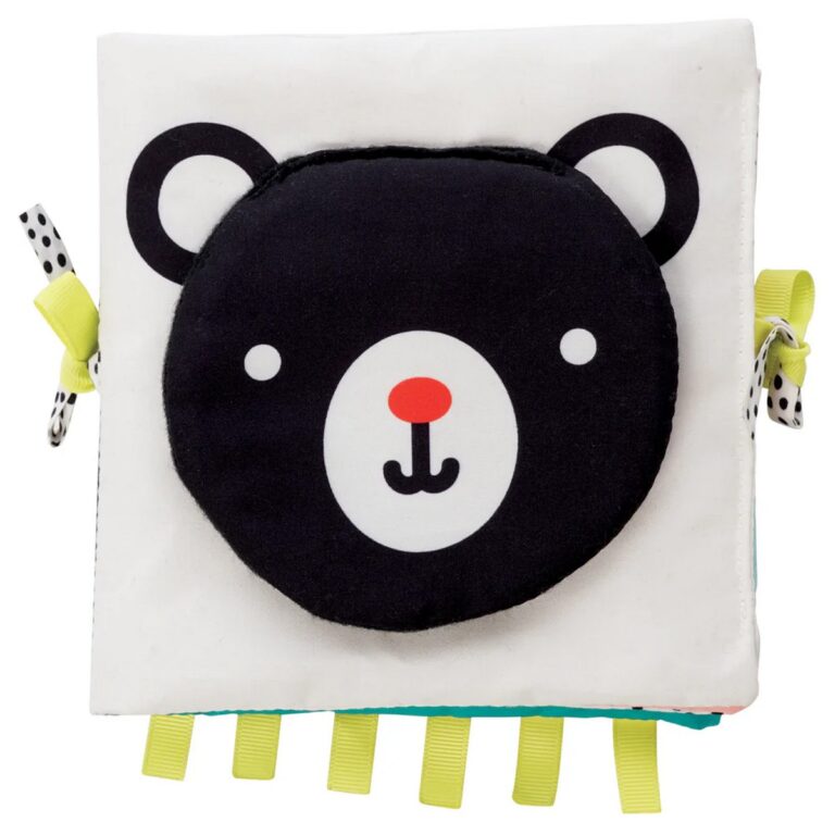 Un lato presenta bianco, nero e rosso, i colori che i neonati percepiscono meglio nei primi mesi, supportando lo sviluppo della vista e la messa a fuoco. L’altro lato propone un mix di colori vivaci per stimolare gradualmente la percezione dello spettro cromatico completo. Le varie texture morbide e i suoni fruscianti incoraggiano l’esplorazione tattile e la stimolazione uditiva, mentre le linguette a scomparsa e i nastri rendono il libro facile da afferrare e da ripiegare.