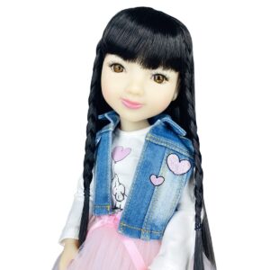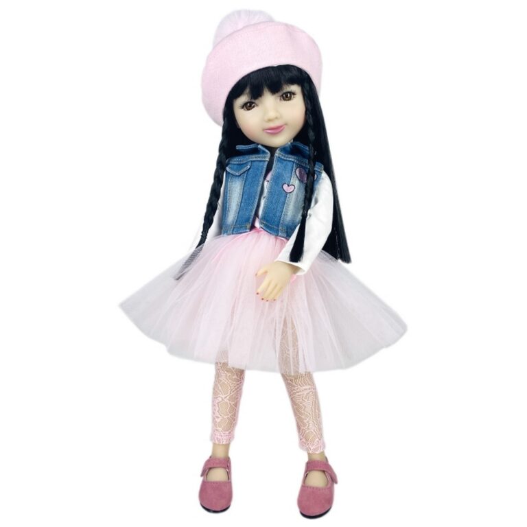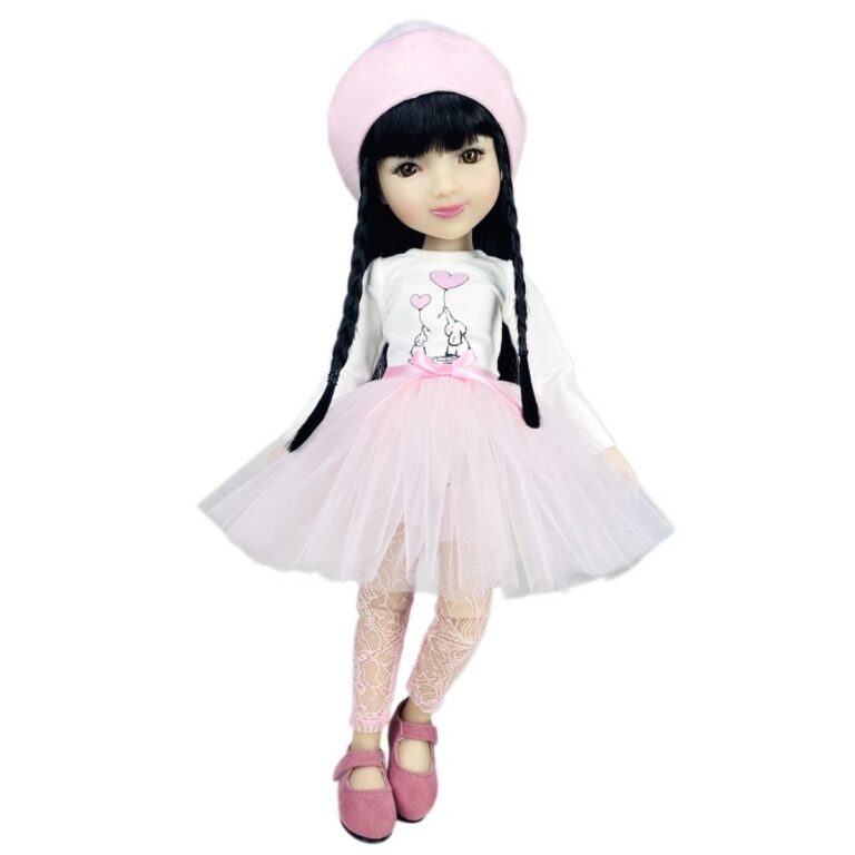 Bambola Lila Ruby Red Fashion Friends - Lila crede nei suoi sogni e che il futuro sarà pieno di arte. Lila ama il balletto, la lettura e la pittura. Esprime la sua gioia attraverso la danza classica. Si considera un'artista seria e usa la sua immaginazione e le sue abilità per salire sul palco. Vive per gli spettacoli di balletto! Ha dei bellissimi e lunghi capelli neri e gli occhi castani. Indossa la sua t-shirt "I can Fly", un gilet di jeans ricamato, un berretto con pompon rosa, gonna a strati in tulle, leggings in pizzo e ballerine rosa. Bambola alta circa 37 cm con 9 articolazioni, corpo in vinile di alta qualità. Età: 6+