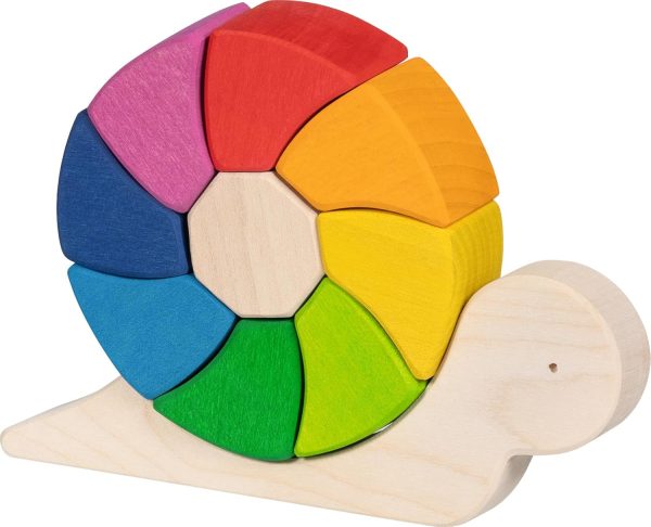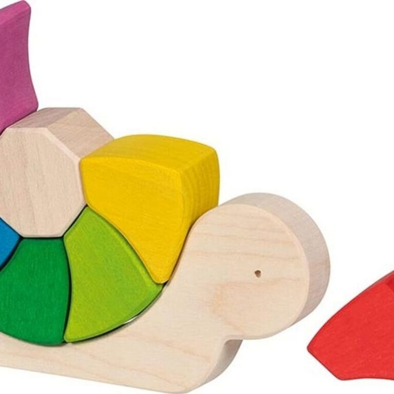La casetta di questa piccola lumaca è composta da nove blocchi in legno dai tenui colori dell’arcobaleno.