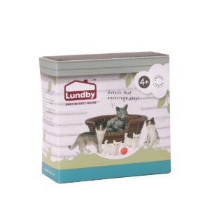 L'adorabile famiglia di gatti Lundby comprende tre gatti e due piccoli gattini e uno di loro ha in mano una palla! C'è un cestino grande e comodo in cui possono riposarsi quando si stancano dopo tutti i giochi. Questo set comprende anche una ciotola per il cibo per i gatti.