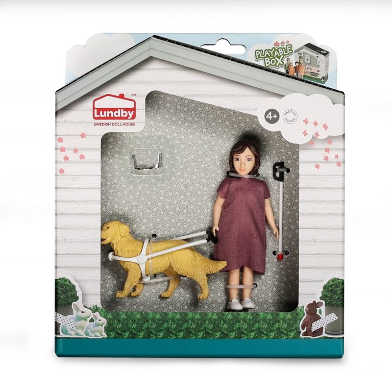 Il seti include: bambola (11cm), bastone, imbracatura, cane guida. I personaggi della casa delle bambole di Lundby possono muovere la testa, le braccia e le gambe.