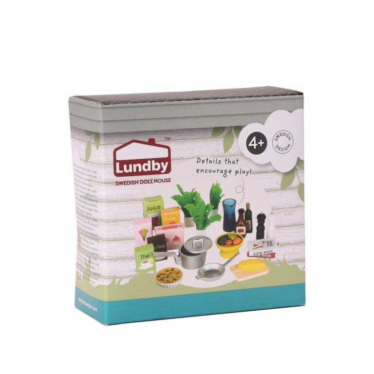 Questo set include wok, ciotola per frutta, torta, pane, tagliere, padella, macina sale e pepe, brocca, erbe aromatiche, ketchup, olio d'oliva, succo e molti altri pacchetti di alimenti e libri di cucina.