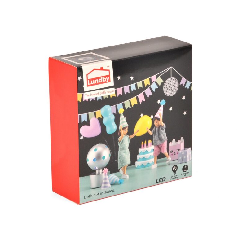 La lampada da discoteca è alimentata a batterie e si adatta a tutte le case delle bambole di Lundby, oppure può stare da sola ovunque nella stanza dei bambini. Sono inclusi anche un mazzo di tre palloncini dai colori vivaci e una deliziosa torta. Per gli invitati alla festa ci sono due pacchetti da regalare e quattro cappellini da indossare.