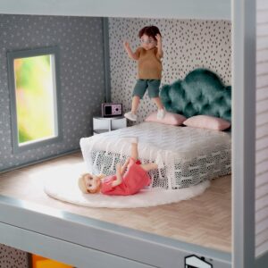 Questo letto con testiera in peluche è proprio lussuoso. Potrai accoccolarti tra la bellissima trapunta in pizzo, godendoti la sensazione del tessuto setoso e rilassandoti sui due cuscini della stessa qualità. Il comodino offre spazio sufficiente per la radio.
