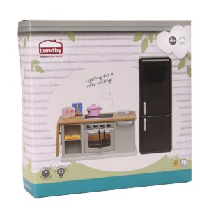 Arreda la tua casa delle bambole con un moderno frigorifero nero e un'elegante isola grigia con dettagli color legno.