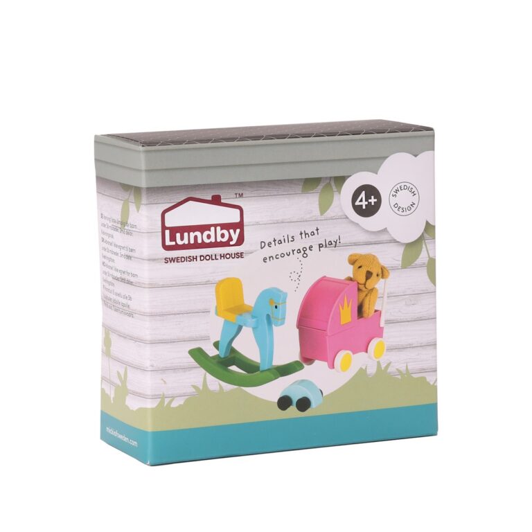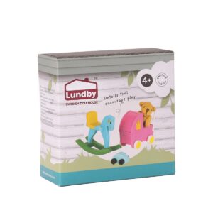 Adorabili giocattoli per il membro più piccolo della famiglia Lundby! Questo adorabile set di accessori Lundby comprende un cavallo a dondolo, una carrozzina per bambole, un'auto e un morbido orsacchiotto.