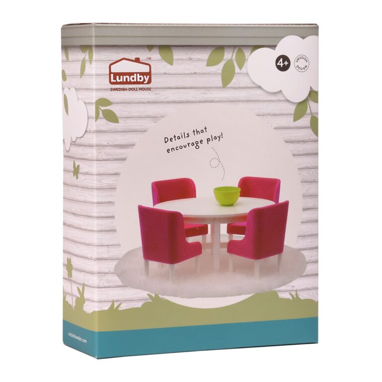 Riunisci la famiglia Lundby e falla sedere su bellissime sedie color ciliegia attorno al tavolo ovale bianco. Questo set include anche una deliziosa ciotola verde e un morbido tappeto.