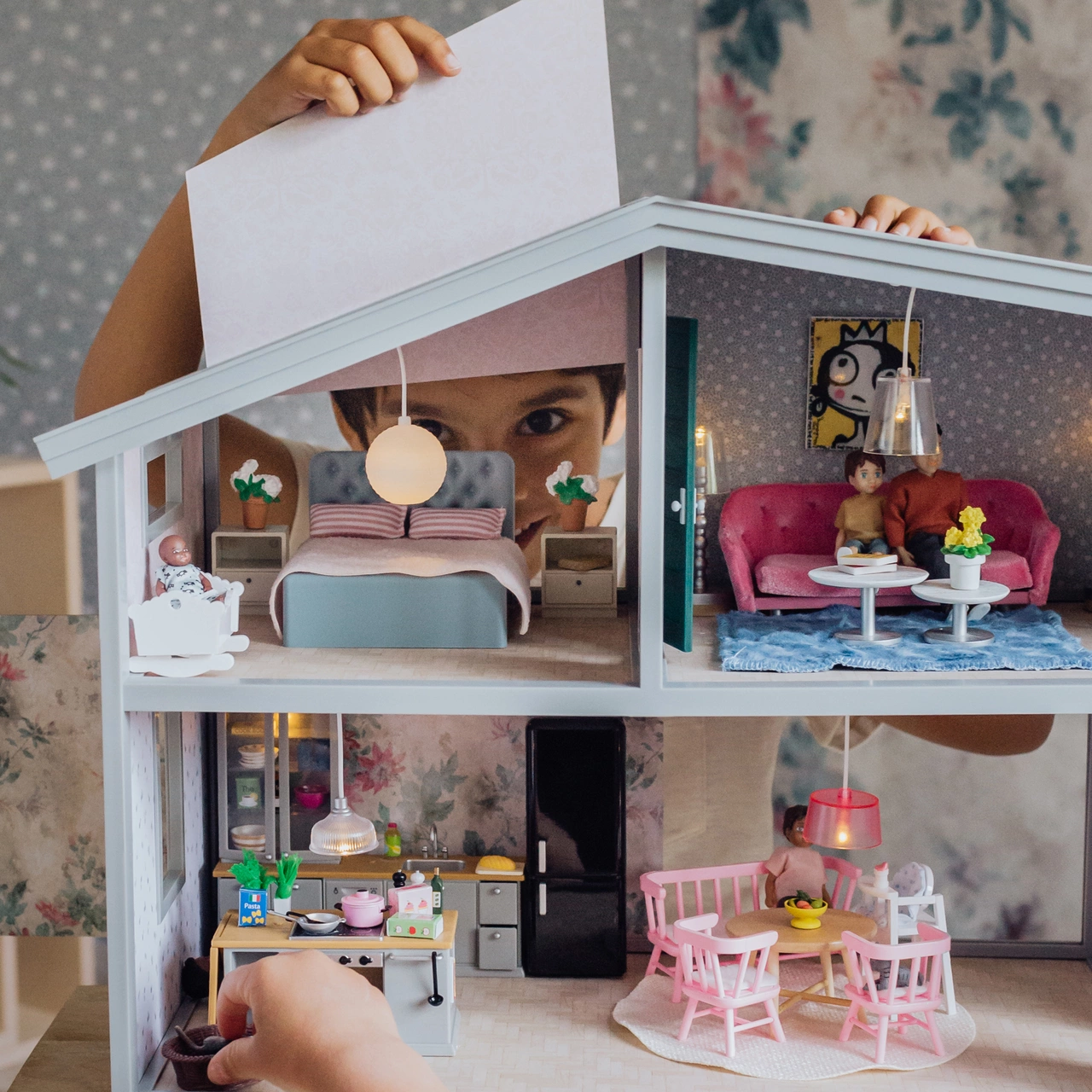 Questo set soggiorno Lundby comprende un divano, due tavolini, un tappeto e un dipinto di Lisa Rinnevuo. Il divano è dotato di rivestimento in peluche per un look più; lussuoso, i tavolini sembrano di legno e hanno due diverse dimensioni. Il tappeto a pelo lungo migliora l'atmosfera accogliente della stanza e un bellissimo dipinto aggiunge un magico tocco finale a questo elegante set Lundby.