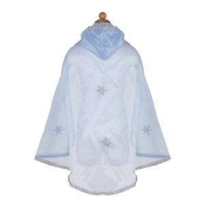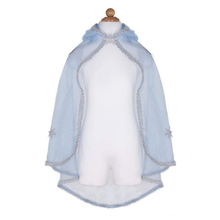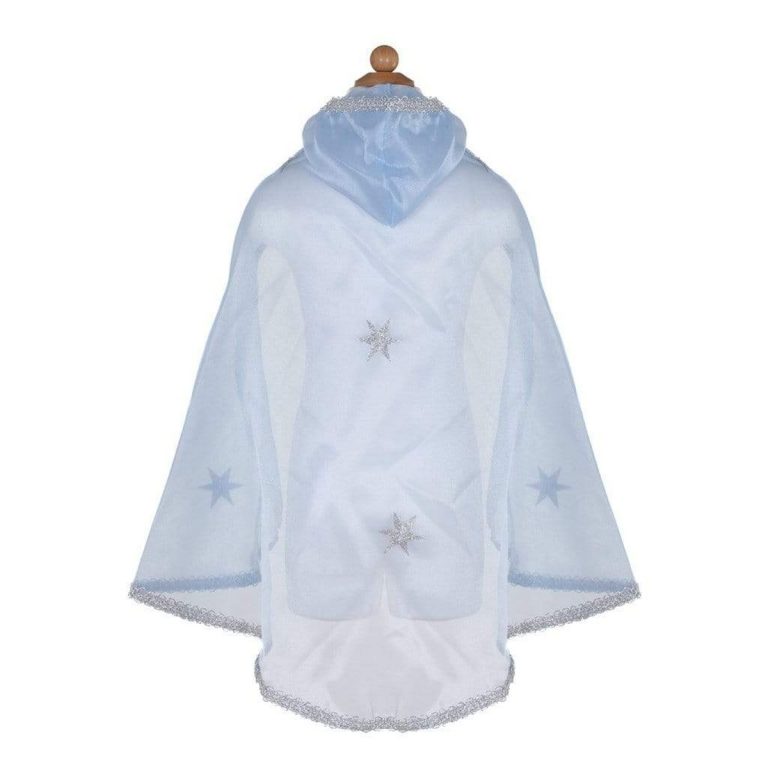 Realizzato in organza di cristallo blu, questo mantello è decorato con stelle scintillanti argento e un ampio cappuccio.