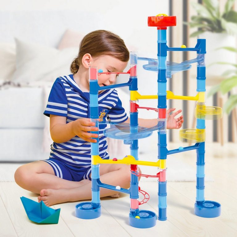 Contenuto: 1+1 partenza muiltipla, 5 piste dritte corte, 7 piste curve a rotaia, 50 colonne trasparenti e colorate, 2 imbuti, 2 alternatori di percorso, 5+5 basi/chiocciola, 2 tappi chiocciola in EVA, 12 biglie colorate.