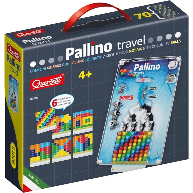 Versione Travel del fratello maggiore Pallino ne condivide le funzionalità e la finalità di gioco: comporre simpatici mosaici con le palline colorate.