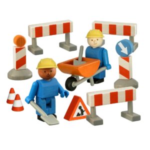 Operai lavori stradali con transenne e cartelli segnaletici. I giocattoli in legno Woody Click sono molto più che semplicemente carini!  Woody Click con un semplice "clic" permette ai bambini di costruire edifici e veicoli usando gli schemi prestabiliti o usando la propria immaginazione promuovendo così la creatività e la concentrazione. Le forme moderne orientate al design allenano e migliorano anche la consapevolezza estetica. Il bambino potrà così vivere tutte le avventure della vita quotidiana, cimentandosi in giochi di ruolo con tanti simpatici personaggi snodabili. Costruiti con legno dell'albero della gomma e colorati con vernice a base d'acqua. Età consigliata: 3+