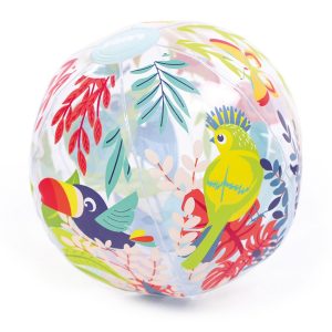 Palla gonfiabile LUDI Jungle Ball leggera e colorata con tema tropicale ed effetti trasparenti. Adatta da 6 mesi per gioco interno/esterno, facile da afferrare, stimola coordinazione ed esplorazione sensoriale.
