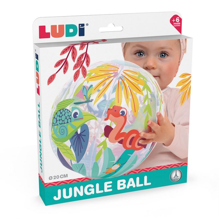 La Jungle Ball LUDI è una palla gonfiabile leggera e colorata (diametro 20 cm) con un design a tema giungla ed effetti trasparenti, pensata per le piccole mani dei bambini dai 6 mesi in su.