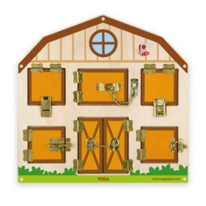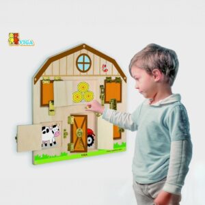 Apri le porte all'apprendimento e alla scoperta con il Pannello Attività in Legno Viga "La Fattoria delle Serrature", un gioco affascinante e interattivo per i bambini dai 18 mesi in su.