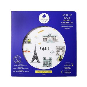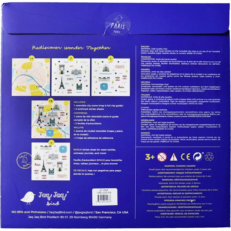 Jaq Jaq Bird STICK IT & GO - Città delle Meraviglie - Parigi. Esplora, immagina e impara a conoscere il mondo che ti circonda attraverso la collezione Cities of Wonder. Ogni set include una mappa della città reversibile e tre fogli di adesivi. La mappa della città presenta una guida completa della città sul davanti e una mappa vuota sul retro per posizionare gli adesivi. I fogli di adesivi includono punti di riferimento, icone, cibi e altro, e il terzo foglio contiene adesivi bonus da applicare su oggetti di tuo gradimento... valigie, diari,borracce ecc.! Il nostro nuovissimo set Cities of Wonder Stick It & Go è il compagno ideale per esplorare ogni città, sia che tu stia esplorando da casa o che tu stia documentando i tuoi viaggi in città vicine e lontane! Riutilizzabile e impermeabile - Età: 3+