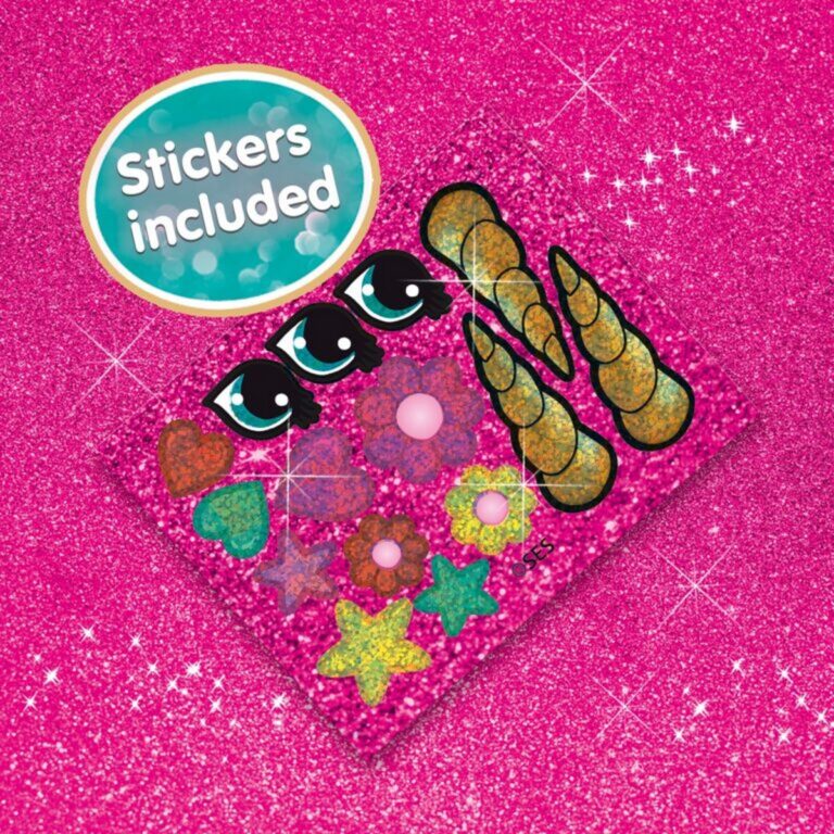 Basta posizionare le perline sulla tavoletta a forma di unicorno, chiedere a un adulto di stirarle per farle fondere insieme e poi decorare le creazioni con gli adesivi glitterati inclusi per un effetto scintillante!