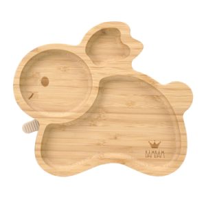Piatto a forma di coniglio, realizzato al 100% in Bambù. Questo simpatico piatto è dotato di base a ventosa antiscivolo e deve essere lavato a mano.