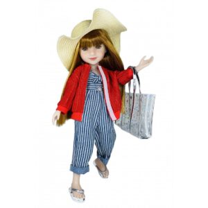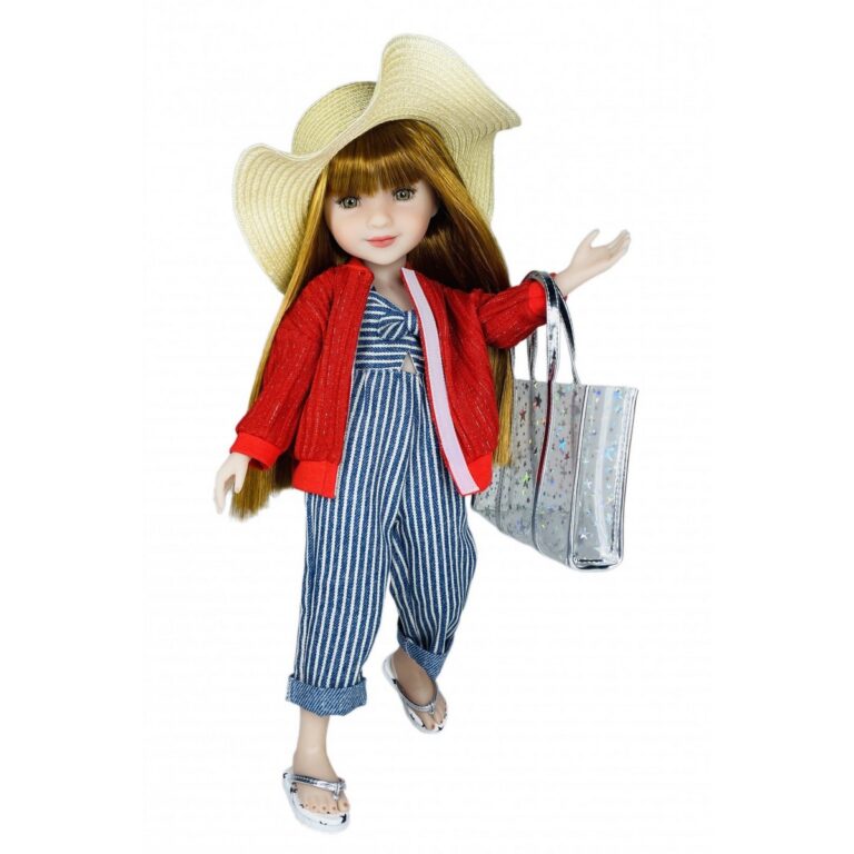 Outfit per bambole Ruby Red Fashion Friends (37 cm). La tua bambola sarà davvero molto elegante con questo favoloso outfit. Pronti per una giornata al parco? L'outfit è composto da tuta in denim, giacca rossa lavorata a maglia, un cappello da sole smerlato, una borsa oversize e infradito. Bambola non Inclusa